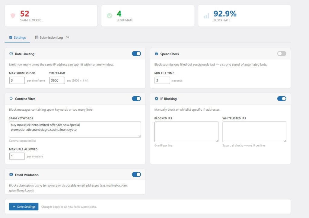 1. ⏱️ Rate Limiting Blocks repeated submissions from the same IP address within configurable time windows. Stops automated submission attacks dead in their tracks.